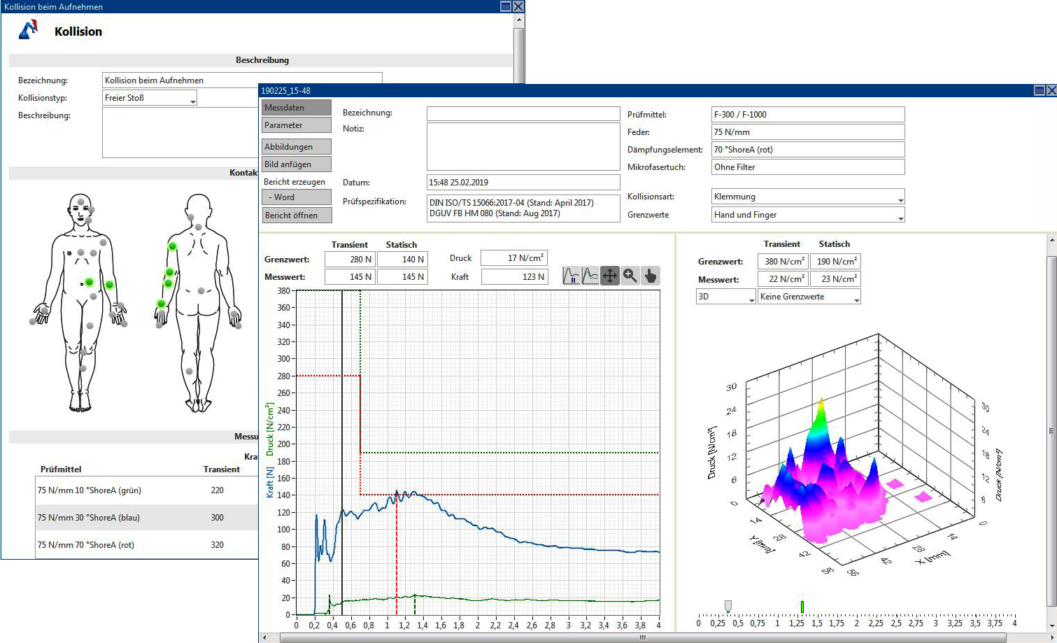CoboSafe-Vision 軟件可將測得的力曲線和壓力圖像可視化。它可以計算并確定瞬態力、準靜態力以及最大壓力值。壓力圖像可以通過二維和三維圖像以及過濾器進行評估。