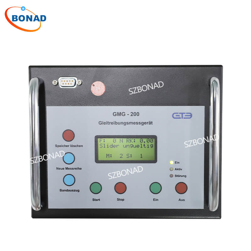 BOT-3000E摩擦計是一款便攜式儀器,用于測量地板的摩擦系數,符合 DIN 51131 和 EN 13893 標準。該測量儀器由主動滑動組件、一組可互換光標、電纜牽引固定角和可充電電池組組成。滑動組件包含牽引機構、測量滑動摩擦力的電子部件、LED 指示燈和電池充電器。 GMG-200設計測量儀用于日常檢查各種地板覆蓋物的滑動摩擦力。根據覆蓋物的不同,滑塊可以互換。滑塊材料、實際室溫和濕度也被檢測并記錄在報告中。 LED指示燈為用戶提供簡單的指導,指示真實的工作狀況并計算滑動摩擦系數。集成的 RS-232 數據接口允許將測量值傳輸到筆記本電腦或 PC,從而可以選擇和精確評估曲線軌跡以及與需要進行的標稱值的偏差。可以打印標準報告。必要的 GMG - VD 軟件可單獨購買,以附件價格購買。該儀器最多可存儲 90 條測量曲線(例如,每條曲線 18 條)。